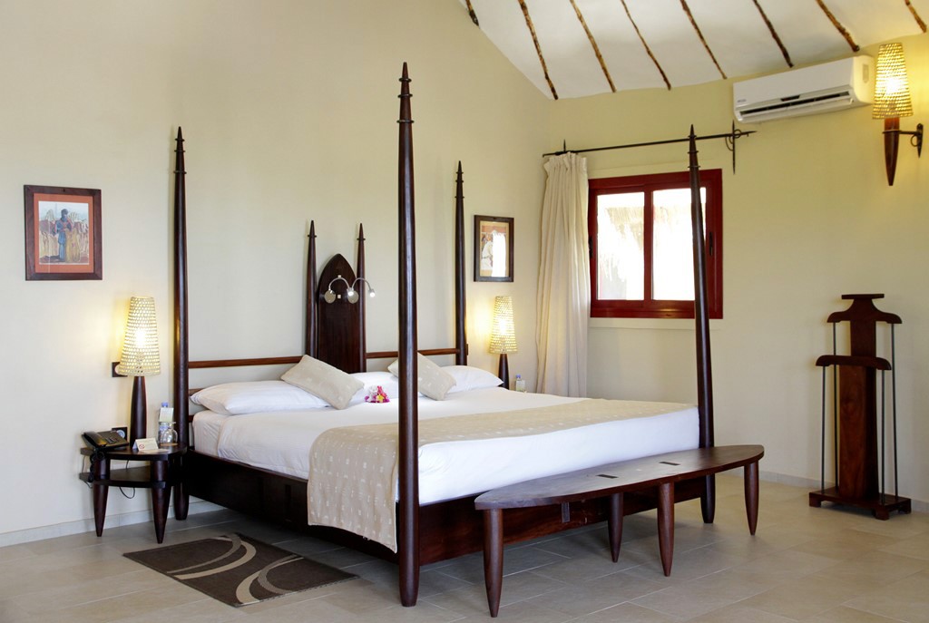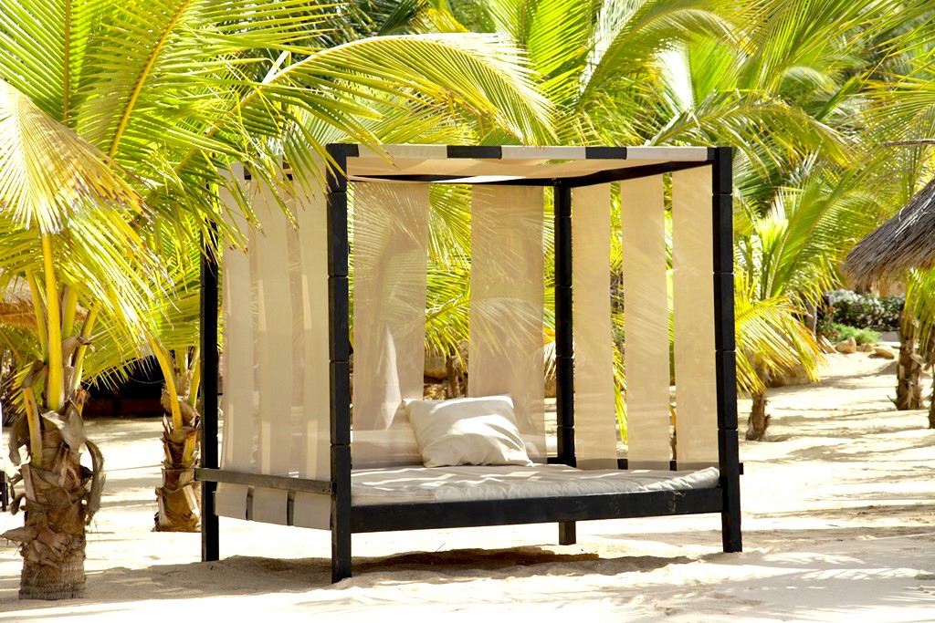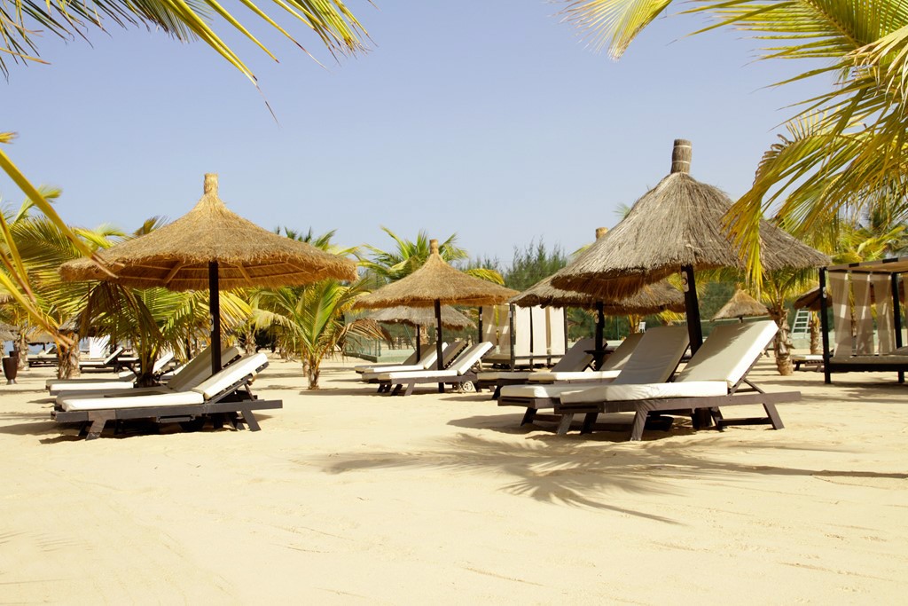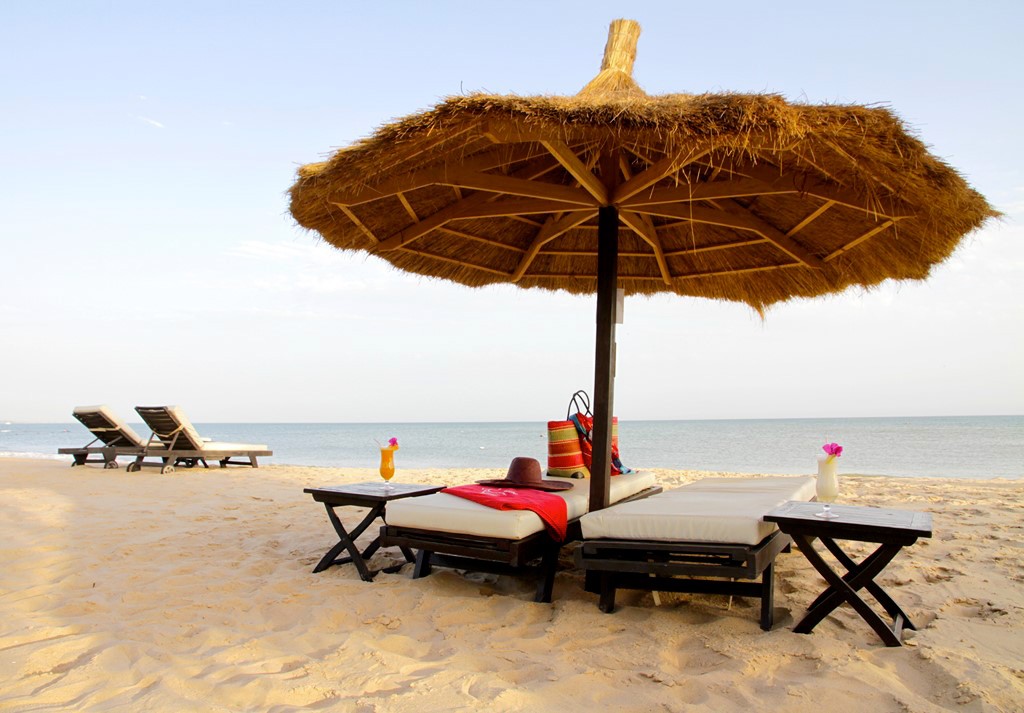 - 1 grande plage privée de sable blond plantée de 300 cocotiers avec un accès direct de l’hôtel équipée de paillotes, transats en bois, lits libanais et hamacs pour votre confort.