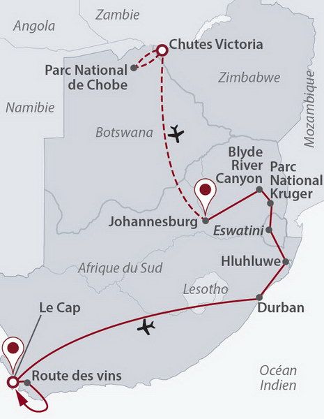 Les Chutes Victoria au Zimbabwe, Jo’burg et Soweto, le canyon de la Blyde River, la faune sauvage du parc Kruger, le pays Zoulou, le Cap avec son art de vivre, les paysages grandioses et la faune du Cap de Bonne Espérance, la Route des Vins.