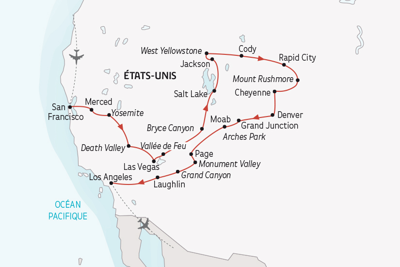Le circuit le plus complet pour découvrir l'Ouest Américain, exceptionnel, tout en contrastes, au coeur des Parcs Nationaux de l'Ouest Américain, à la découverte de paysages naturels époustouflants mais aussi des grandes villes de l'ouest, de San Francisco à Las Vegas, jusqu'à Los Angeles...