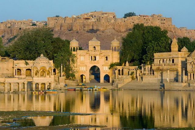 Route à travers les paysages bruts du désert du Thar. Arrêt au fort de Pokaran pour déjeuner et poursuite vers Jaisalmer. Balade autour du réservoir de Gadisar, ensemble de temples et de kiosques au bord d’un lac puis excursion à la colline de Bada Bagh, où reposent les cénotaphes royaux. (P.déj+Déj+Dîn)