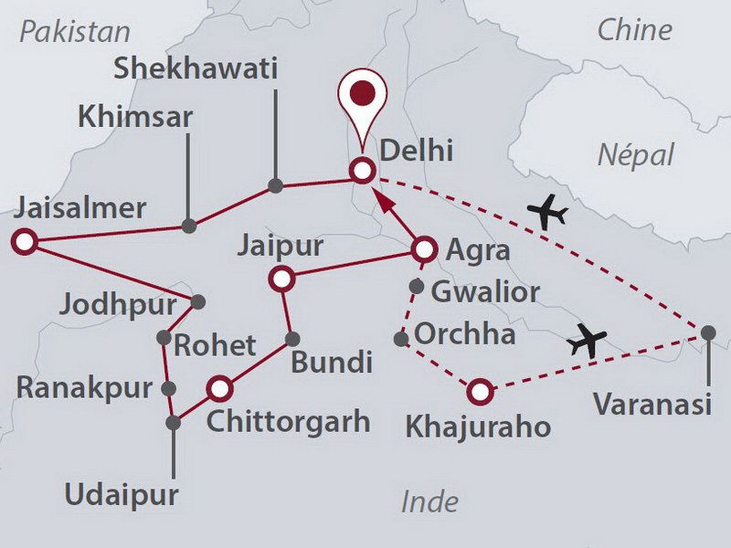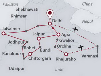 Les havelis du Shekhawati, la citadelle de Jaisalmer, Jodhpur la ville bleue, la romantique Udaipur, Jaipur la ville rose, la cité impériale de Fatehpur Sikri et le fantastique Taj Mahal, les temples sensuels de Khajuraho et la ferveur de Bénarès.