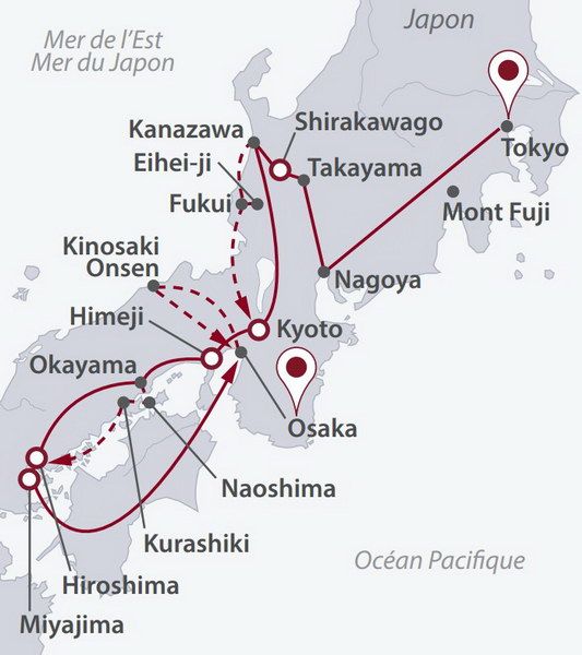 16 jours / 14 nuits Selon programme Un voyage emblématique pour découvrir les multiples facettes du Japon : contemporain à Tokyo et Osaka, traditionnel à Kyoto, Takayama et Kanazawa, historique à Hiroshima, Himeji et Miyajima. Ajoutez des détours pour donner une touche unique à votre circuit privé.-