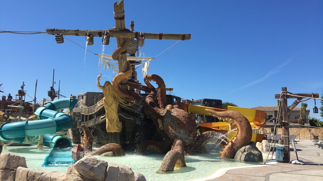 Espace aquatique extérieur : ouverture partielle du 08/05 au 29/05 et du 07/09 au 21/09, fermeture au 21/09 parc aquatique de 9500 m2 thème pirates : 2 pataugeoires, 1 gigantesque bateau Pirate, 1 bains à remous à remous, 1 pi