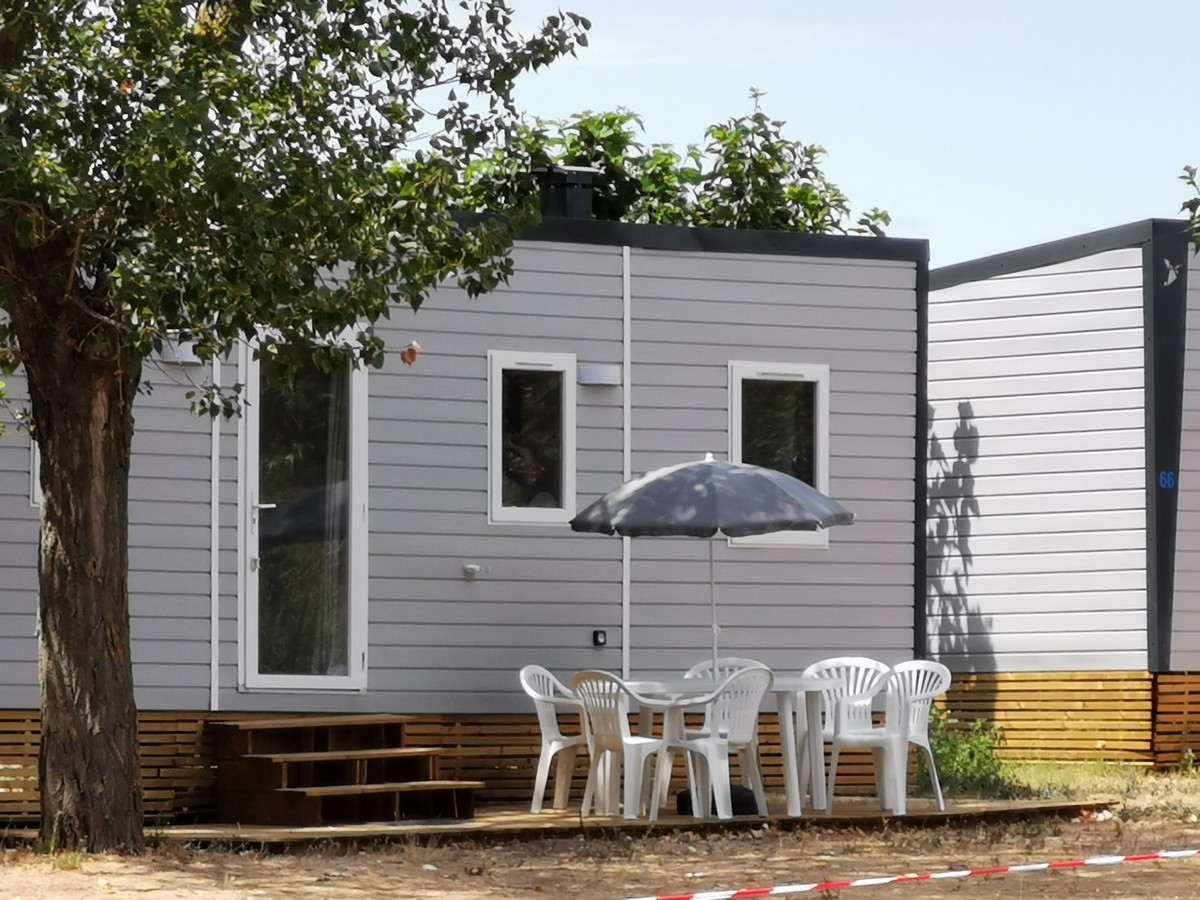 Mobil Home 2 chambres 4 places, terrasse semi-couverte, Clim, 28m², (modèle 2021): Coin nuit : une chambre avec 1 lit double (140x190), une chambre avec 2 lits simples (90x190) côte à côte, oreillers et couvertures ou couettes fournis. Coin salon/séjour : cuisine équipée (évier, feux gaz, réfrigérateur/congélateur, cafetière, micro-ondes, vaisselle), climatisation. Sanitaire : salle d'eau avec douche et lavabo. WC séparé. Extérieur : terrasse semi-couverte avec salon de jardin. Non équipé de télévision et chauffage Animaux admis (selon conditions)