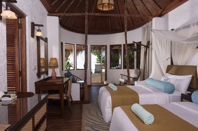Un ravissant hôtel conçu en harmonie avec la nature, le tout dans un style maldivien intimiste, et offrant beaucoup d’espace sur cette petite île-resort composée de seulement 36 Deluxe Beach Bungalows. Enfouis dans une végétation luxuriante, les bungalows construits dans le style local avec toit de palme sont spacieux (40m²), très agréables et aménagés chaleureusement avec mobilier de bois, rotin, cotonnades, parquet… Dotés de tout le confort moderne (climatisation, ventilateur, mini-bar, thé/café, eau minérale…), ils ont tous un accès direct à la plage depuis leur petit jardin équipé de chaises longues. Pour les familles, possibilité de loger jusqu’à 3 personnes ou de réserver 2 bungalows côte à côte. Offres pour les jeunes mariés avantageuses : nous consulter.