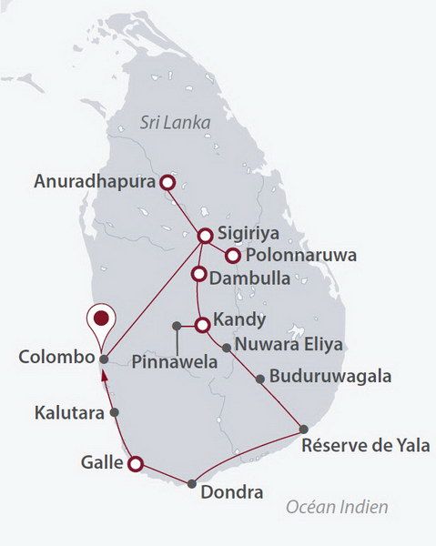 Un court trajet en tuk-tuk et en train local, un spectacle de danses kandyennes, la visite d’une plantation de thé, la rencontre avec les éléphants de Pinnawela, un safari dans la réserve de Yala et une pause balnéaire à Kalutara.